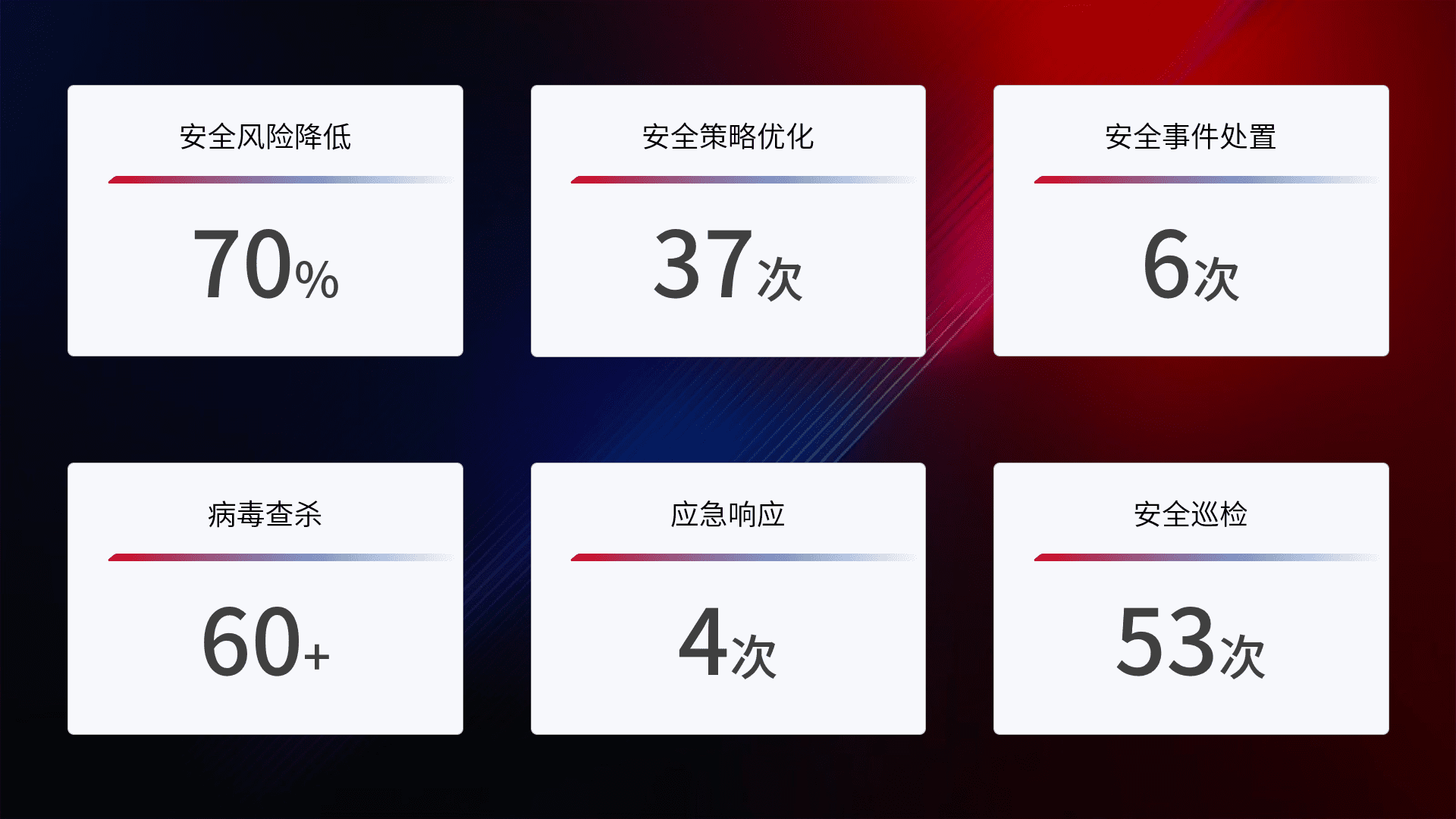 提供全面的安全事件报告体系,,,包括处置报告、、周报、、季度和年度总结,,,结合持续监控,,帮助客户深入了解网络安全状况。。